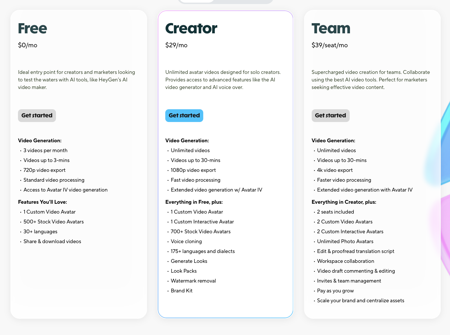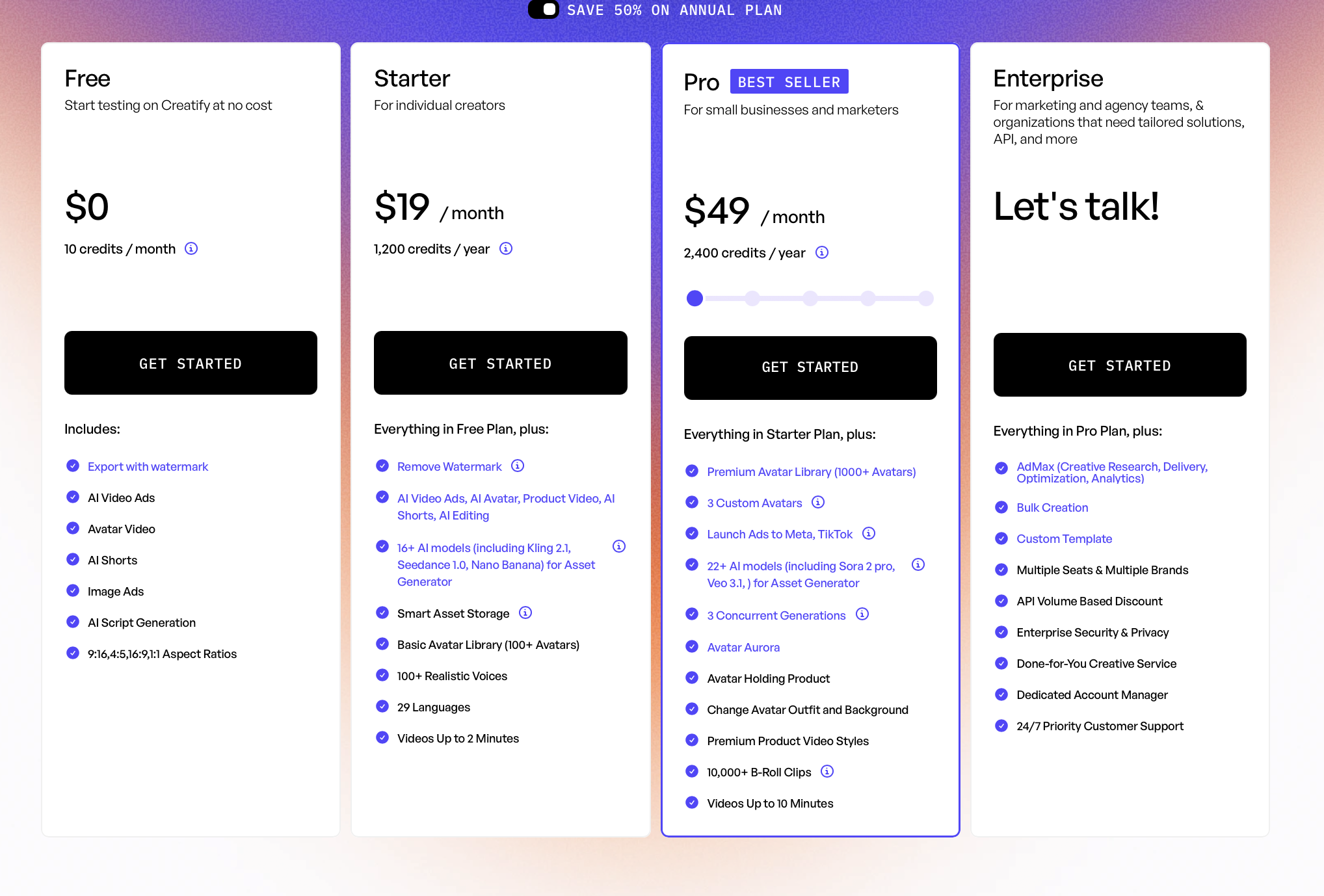 Pricing: Starter plans are $19 per month for creators for 1200 video credits per year and scaling up to $49 for Pro plans.