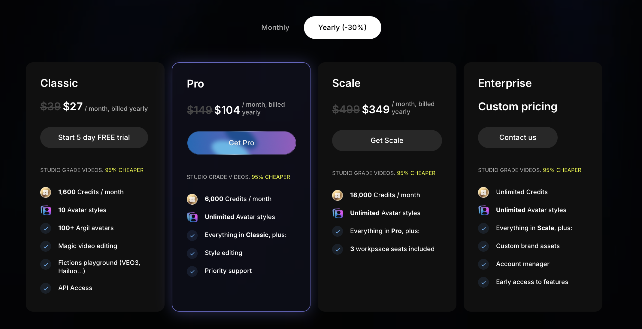Pricing: Starts at $27 per month for creators, and rising to $104 per month for the pro plan – Argil is comparable to HeyGen, but you really get much better value.